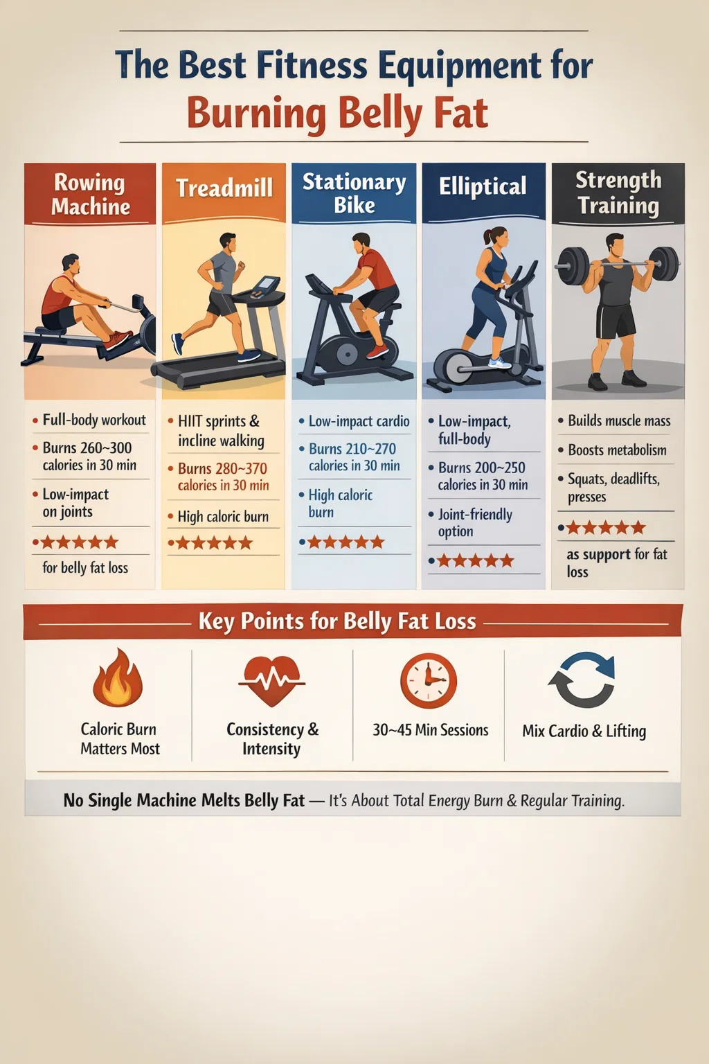 If you want a straight answer: the rowing machine, stationary bike, and treadmill consistently outperform other fitness equipment for burning belly fat — but only when combined with enough intensity and frequency. No single machine melts fat in isolation. What matters is how much total energy you burn, how well the equipment supports sustained cardio, and whether you can use it consistently over weeks and months. Below, this article breaks down the top options, the science behind why they work, and how to actually use them to see results in your midsection.