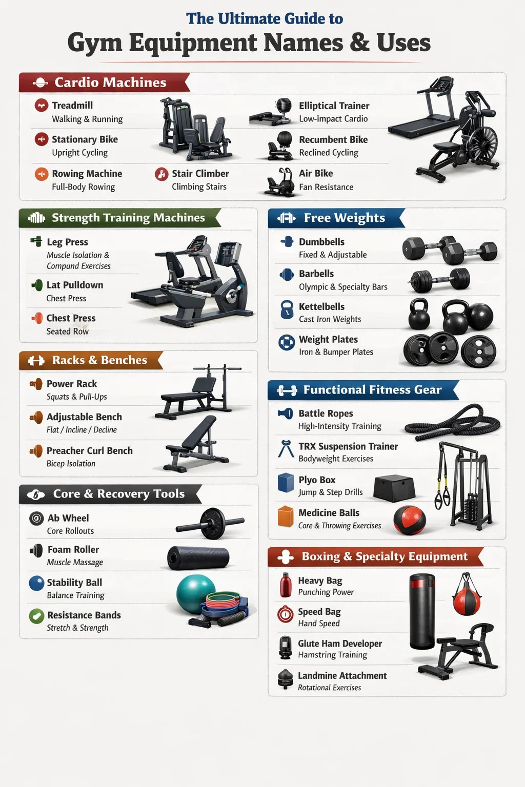Whether you're building a home gym, starting at a commercial fitness center, or just trying to learn the terminology before your first session with a personal trainer, understanding the names and functions of gym equipment is the first step toward using them confidently and safely.